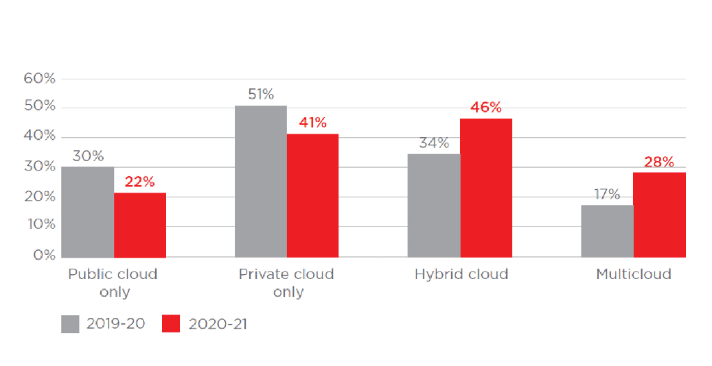 ハイブリッドマルチクラウドインフラストラクチャに対する共同の取り組みの原動力となっているのは、クラウドのみの導入環境からハイブリッドおよびマルチクラウド戦略へのシフトが進んでいることです。エクイニクス テクノロジートレンドに関するグローバル調査(2020~21年度)の報告によると、ハイブリッドクラウドの採用が12%、マルチクラウドモデルが11%それぞれ増加しているのに対し、パブリッククラウドのみとプライベートクラウドのみの採用はそれと同様の割合で減少しています。企業の46%がハイブリッドクラウドモデルを使用し、28%がマルチクラウドモデルを使用しています。