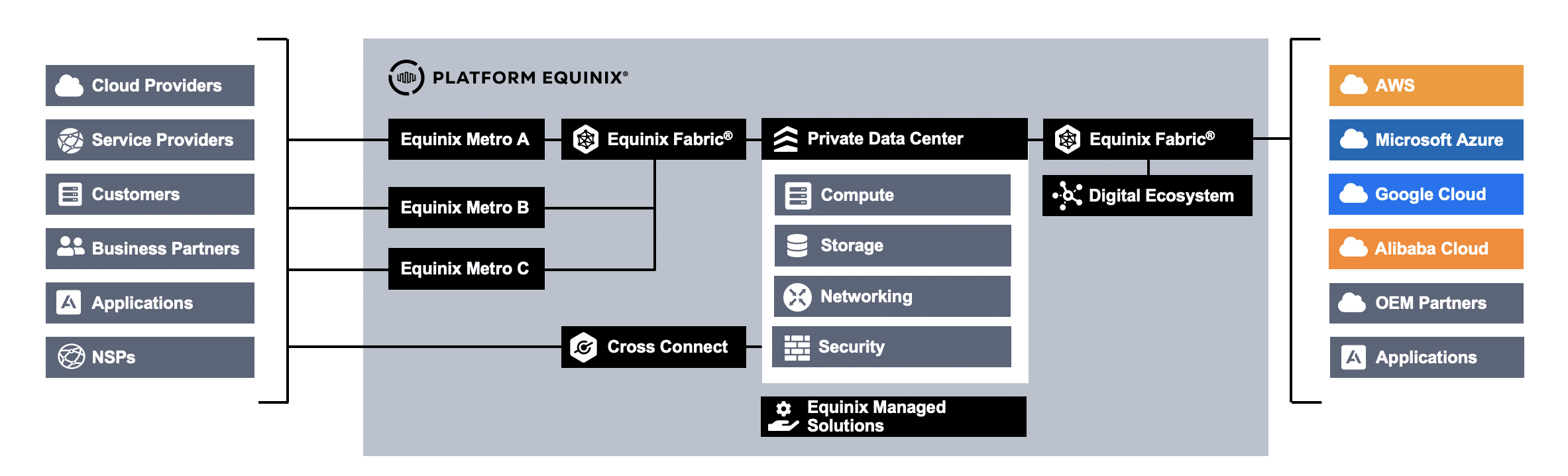Our high-performance data centers are in key business hubs across 74 metros on six continents to ensure global reach and proximity. Using Equinix Fabric, SMB tech providers can create scalable connections between owned infrastructure in different locations and access all the major cloud providers via our 220+ cloud on-ramps. They can also access the Equinix ecosystem, which includes 3,000 cloud and SaaS providers, 2,000 network service providers and 4,800 enterprises–all interconnected for seamless integration to optimize costs, performance and functionality.