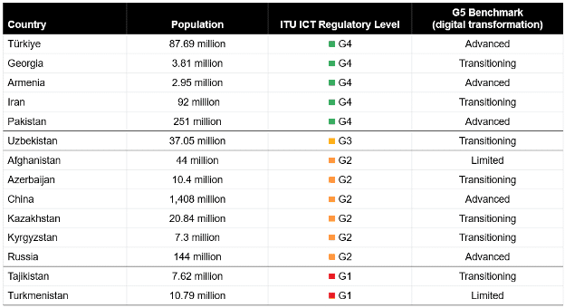 While it’s true that internet penetration is growing rapidly in some of these countries, other factors are standing in the way of further digital growth. As the table below shows, Türkiye, Georgia and Armenia have reached G4 maturity in the ITU ICT Regulatory Tracker, defined as “integrated regulation—led by economic and social policy goals.”[10] However, lower regulatory maturity in other countries prevents market competition and discourages global technology companies from entering the region.