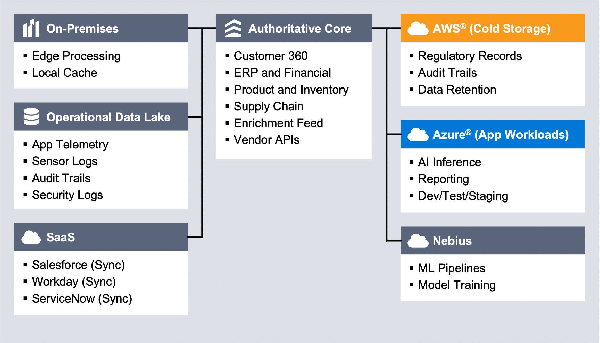 This is the data that holds the most potential value for your business, including proprietary customer insights, core product data and competitive intelligence. It’s important to keep this data out of cloud native storage, where you might lose control over it. Instead, it belongs on neutral storage infrastructure, where it’s both accessible and portable. We call this neutral storage environment the authoritative data core. This signifies that any data you store there is the authoritative copy of that data.
